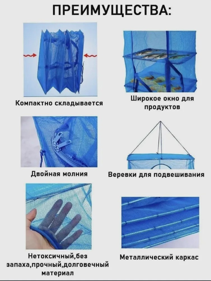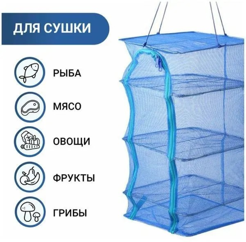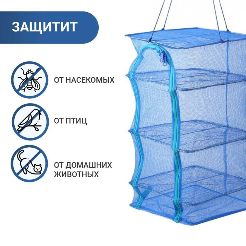 Сетка для сушки рыбы трехъярусная 40х40х75 см предназначена для приготовления вяленой рыбы, сушки грибов и фруктов. Полки внутри конструкции позволяют равномерно распределить просушиваемые продукты, а мелкие ячейки сетки предотвращают попадание насекомых внутрь. Молния расстегивается с двух сторон. Сверху есть веревка для подвешивания. Также снизу сетки идет мини отделение для поддона, или подсушенных продуктов. Компактно складывается и не займет много места при транспортировке.